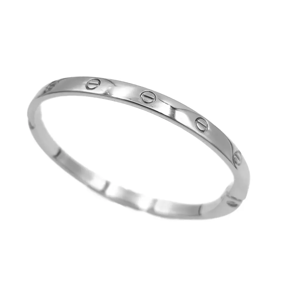 Inspirado no icônico bracelete Love da Cartier, nosso bracelete mantém a mesma padronagem de desenho de pregos ao seu redor, banhado a ródio branco, o nosso bracelete possui fecho click que confere muita praticidade para colocar e tirar seus acessórios. Com um design atemporal essa peça ganha o coração de qualquer mulher. Ela combina com tudo e com todos os momentos.
