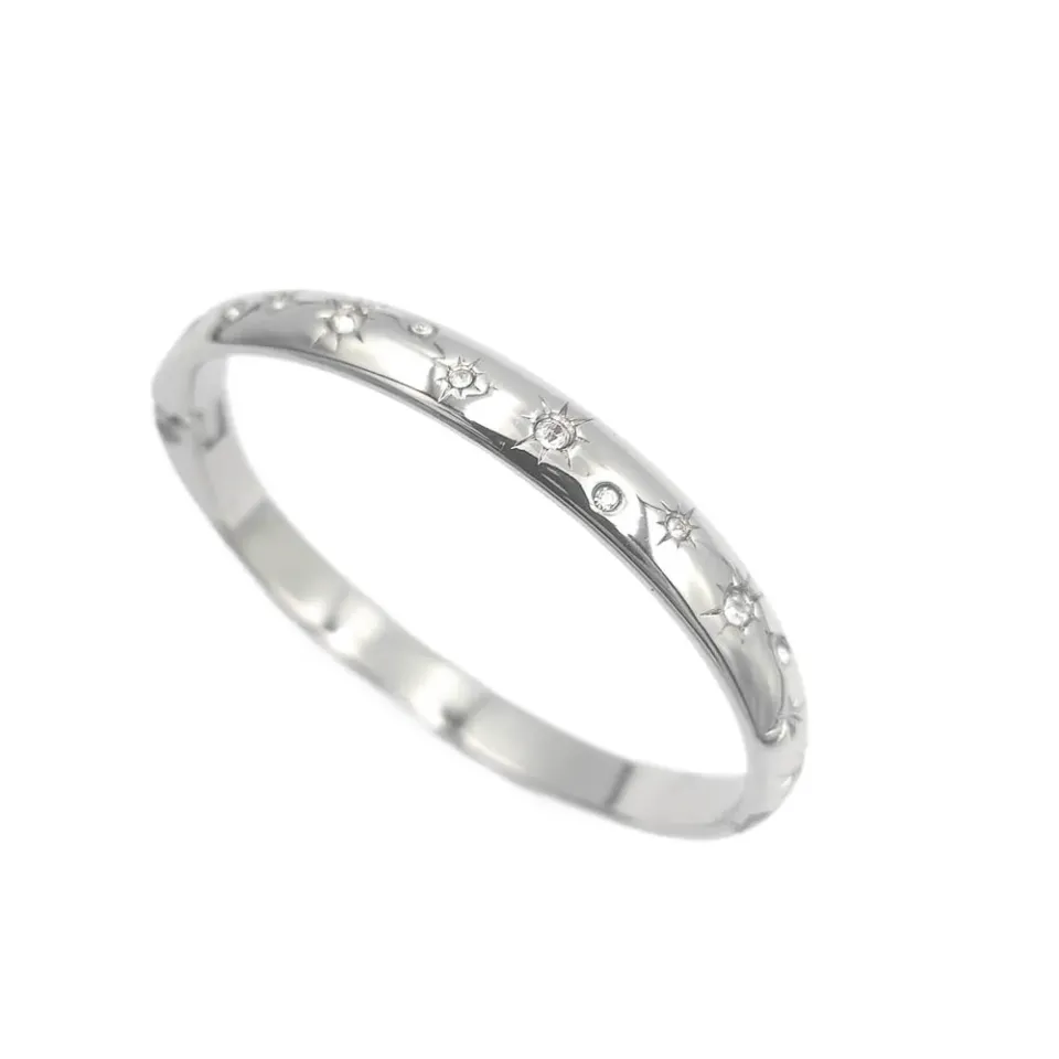 Bracelete ideal para usar tanto no dia a dia quanto em eventos! Esse modelinho traz consigo um olhar elegante e cheio de si. Perfeito para você que ama joias inspiradas na grife de joias Hstern. O bracelete é composto por estrelas em diversos tamanhos cravejadas com strass, é banhado a ródio branco e fechamento de click. Use e abuse da criatividade para compor seus mix!
