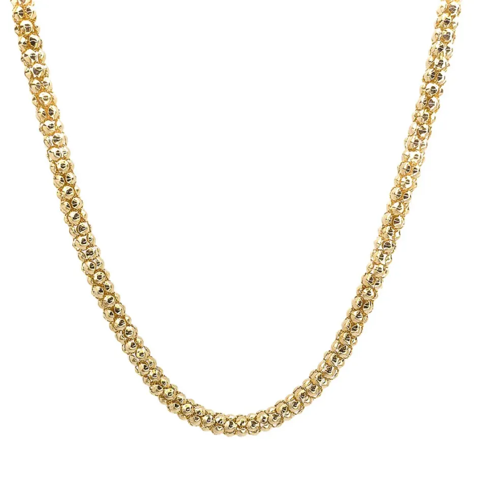Seus elos são pequenas cúpulas entrelaçadas que lembram a textura de um morango, é um colar extremamente leve pois é vazado, possui banho de ouro 18k de altíssima qualidade, um extensor com elos grandes e fecho lagosta.